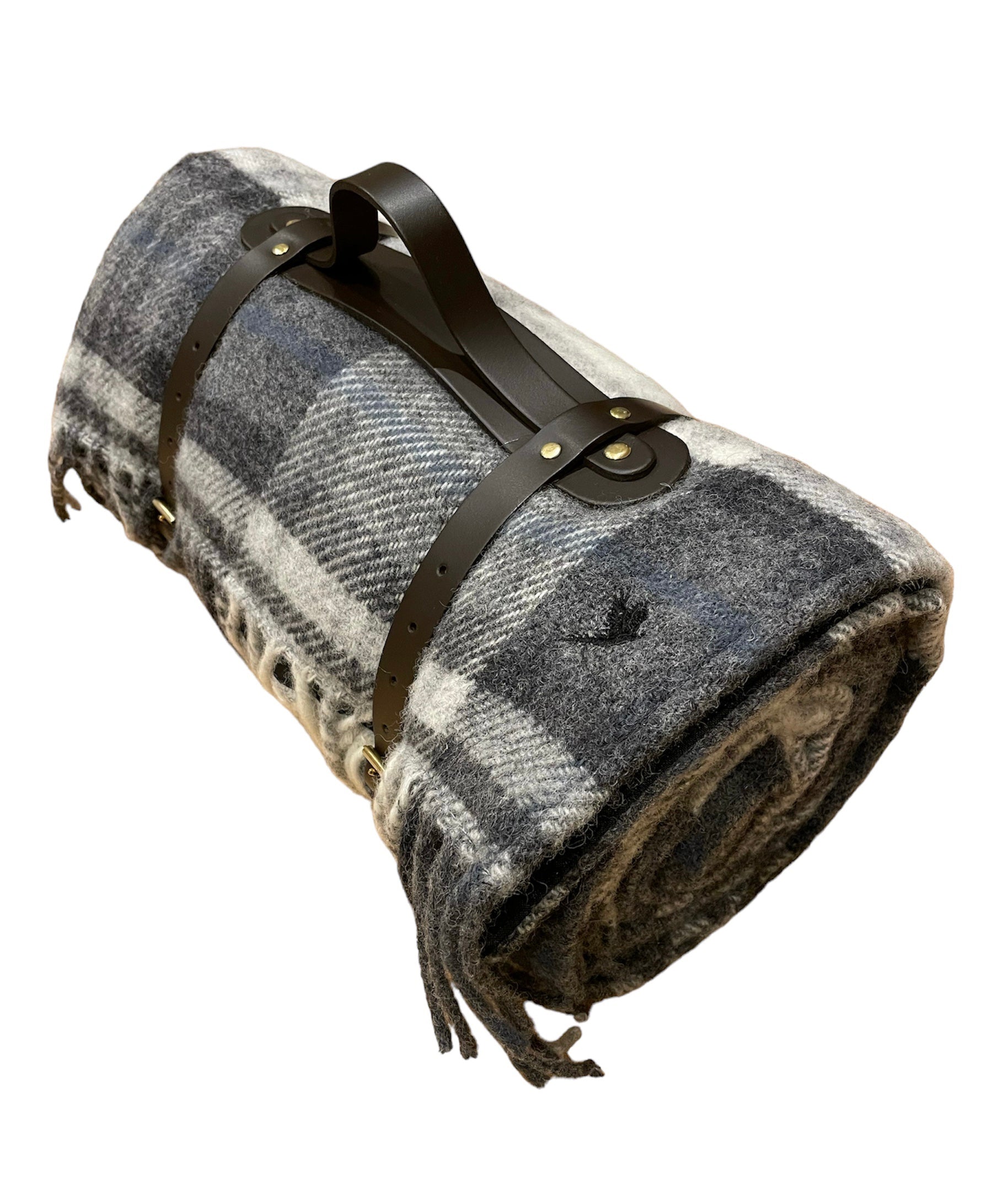 POLO PICNIC BLANKET, COTTAGE GREY WITH BLACK EMBROIDERED PHEASANT INSIGNIA AND LEATHER STRAPS